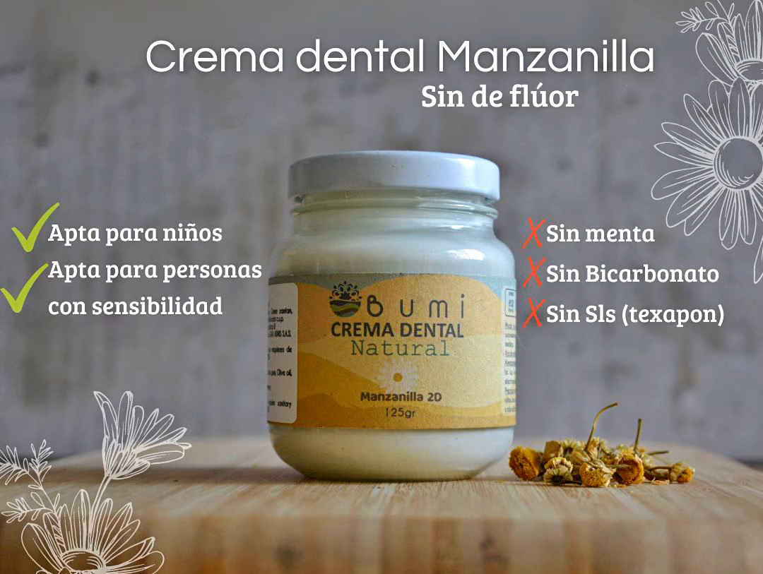 Crema dental sin fluor y sin bicarbonato para niños y adultos: la creación y elaboración de la crema dental homeopática de manzanilla, está indicada para niños desde el inicio de su dentición.
