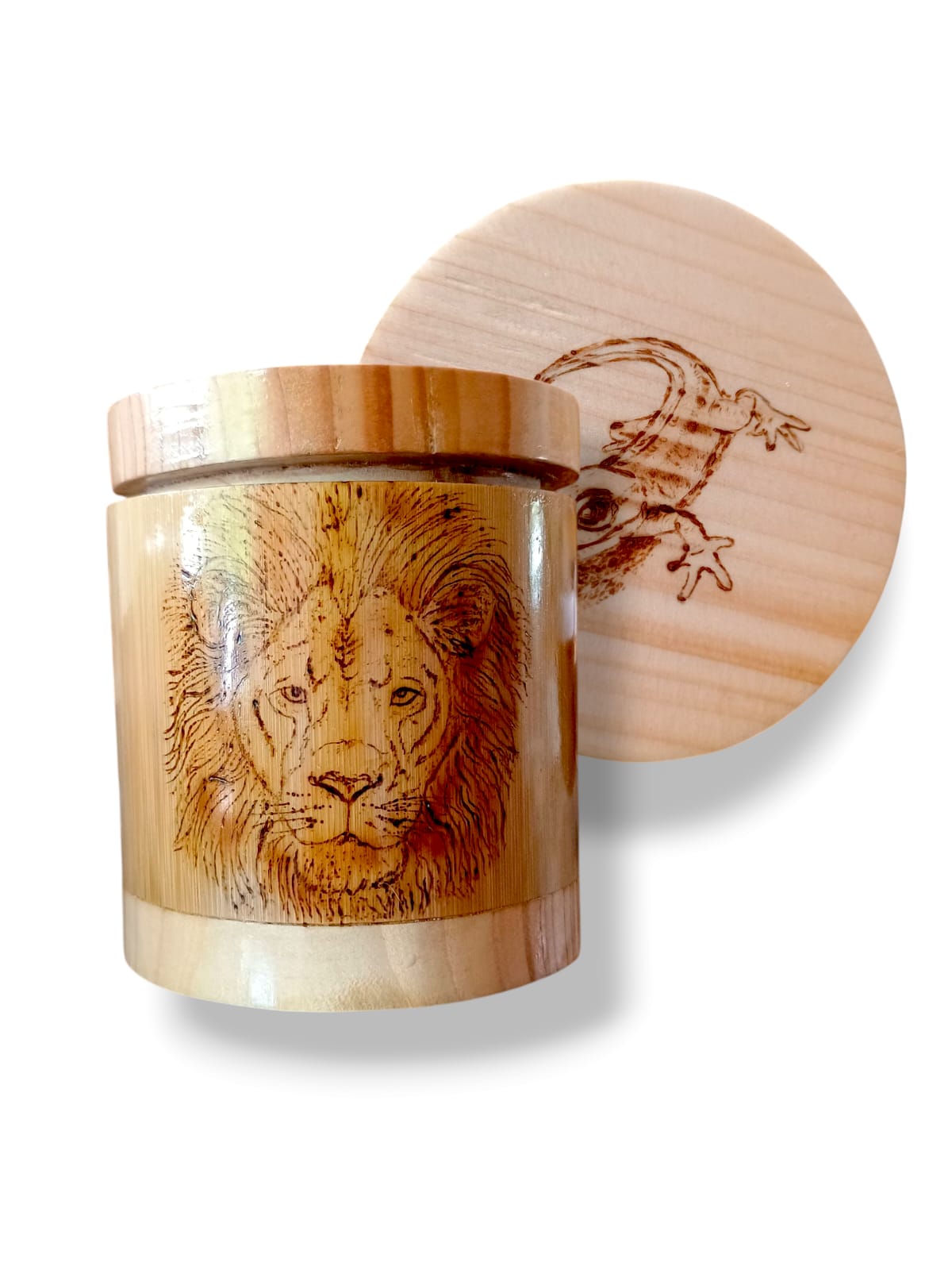 Presentamos nuestro hermoso tarro artesanal en madera de pino, ideal para conservar hasta 125 g de mambe (cuarto). Cada pieza es única: tallada a mano con 3 dibujos de tu elección, representando los animales, símbolos o espíritus que más resuenen contigo 🐆🦅🐢.